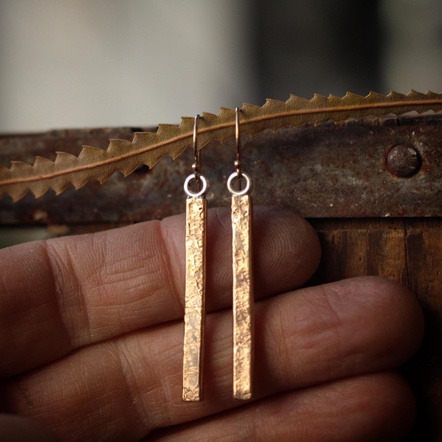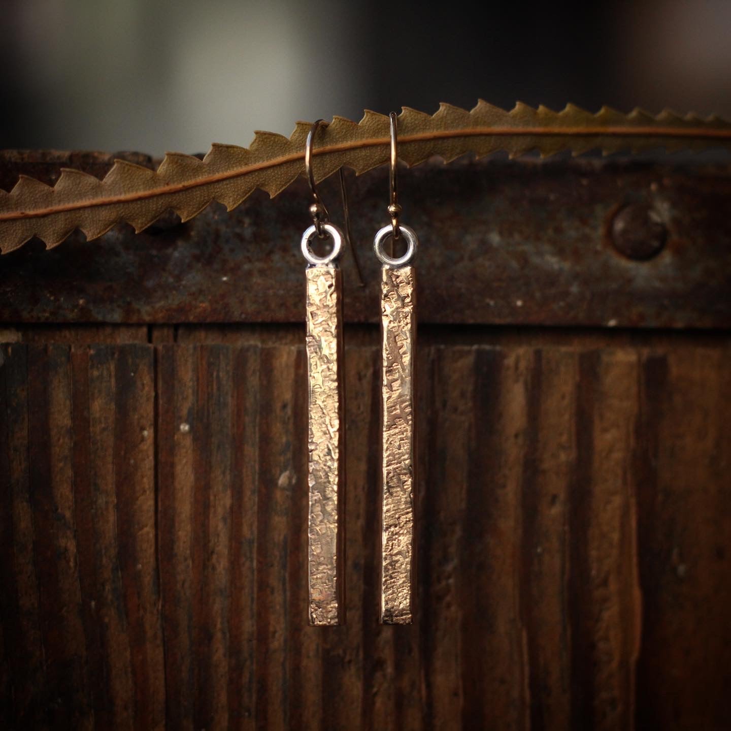 These simply beautiful earrings are made from heavy-gauge 14k gold-filled wire that has been hammered flat and textured with an organic, raw silk pattern. A single sterling silver circle has been soldered to the top of each bar, from which gold French wires are suspended. Earrings measure 2" in length (including French wire).