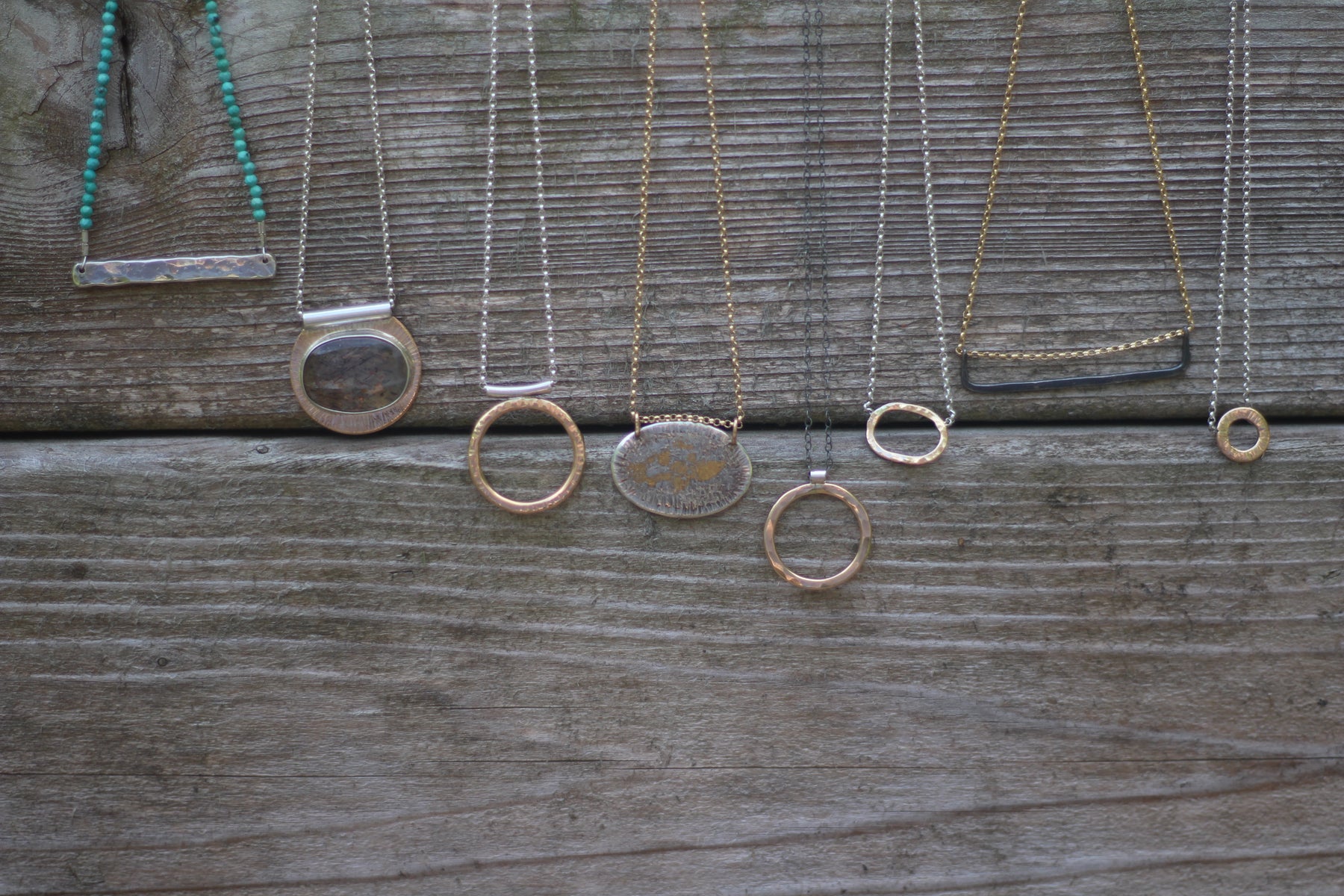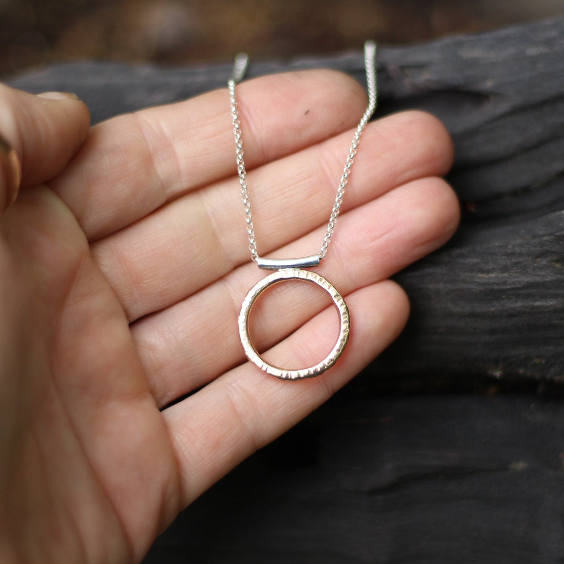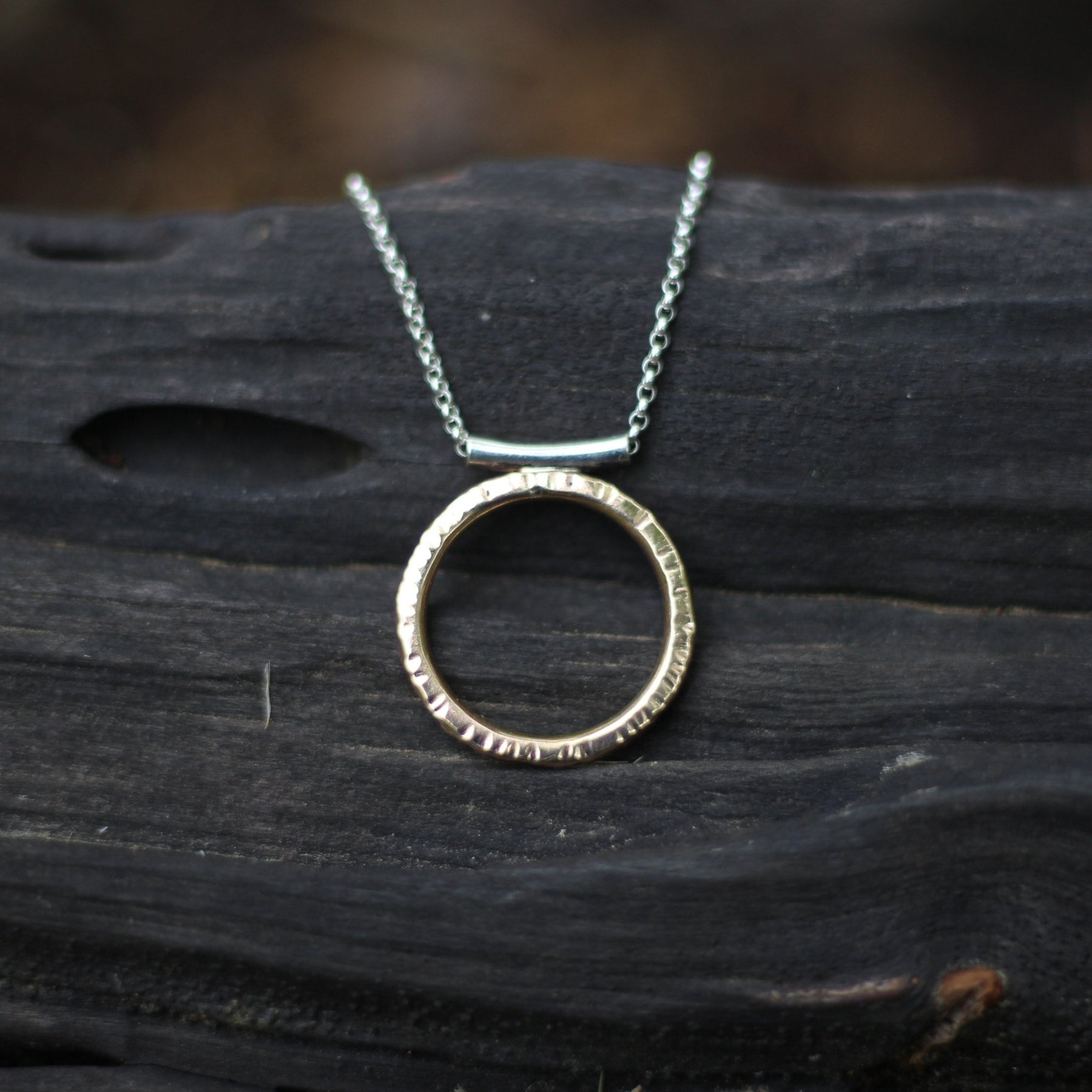 This simple yet beautiful necklace is made from a heavy piece of 14k gold-filled wire that was formed into a circle, soldered closed, and hand-textured. It is suspended from a sterling silver tube bail and sterling silver rolo chain. Closure is a handmade 14k gold-filled hook and eye clasp. This necklace looks beautiful layered with other necklaces or worn alone.
