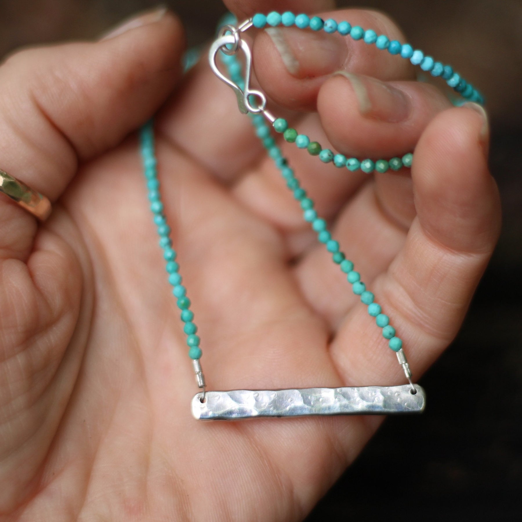 This organic and beautiful necklace is made from a heavy piece of sterling silver flat wire that was cut, filed, and hammered to form a simple bar pendant. The bar is suspended by delicate faceted turquoise beads. Closure is a sterling silver hook and eye clasp. This necklace looks beautiful layered with other necklaces or worn alone.