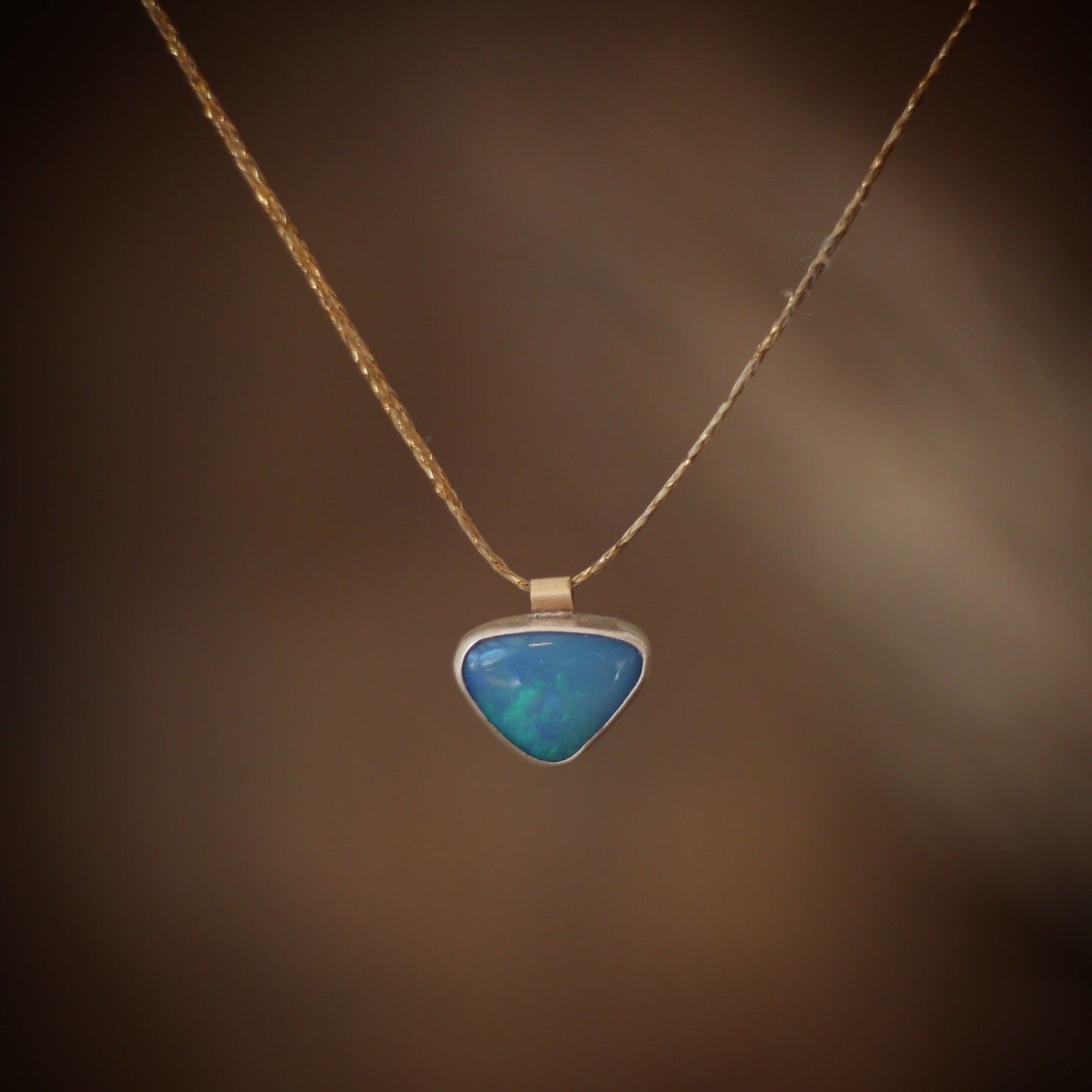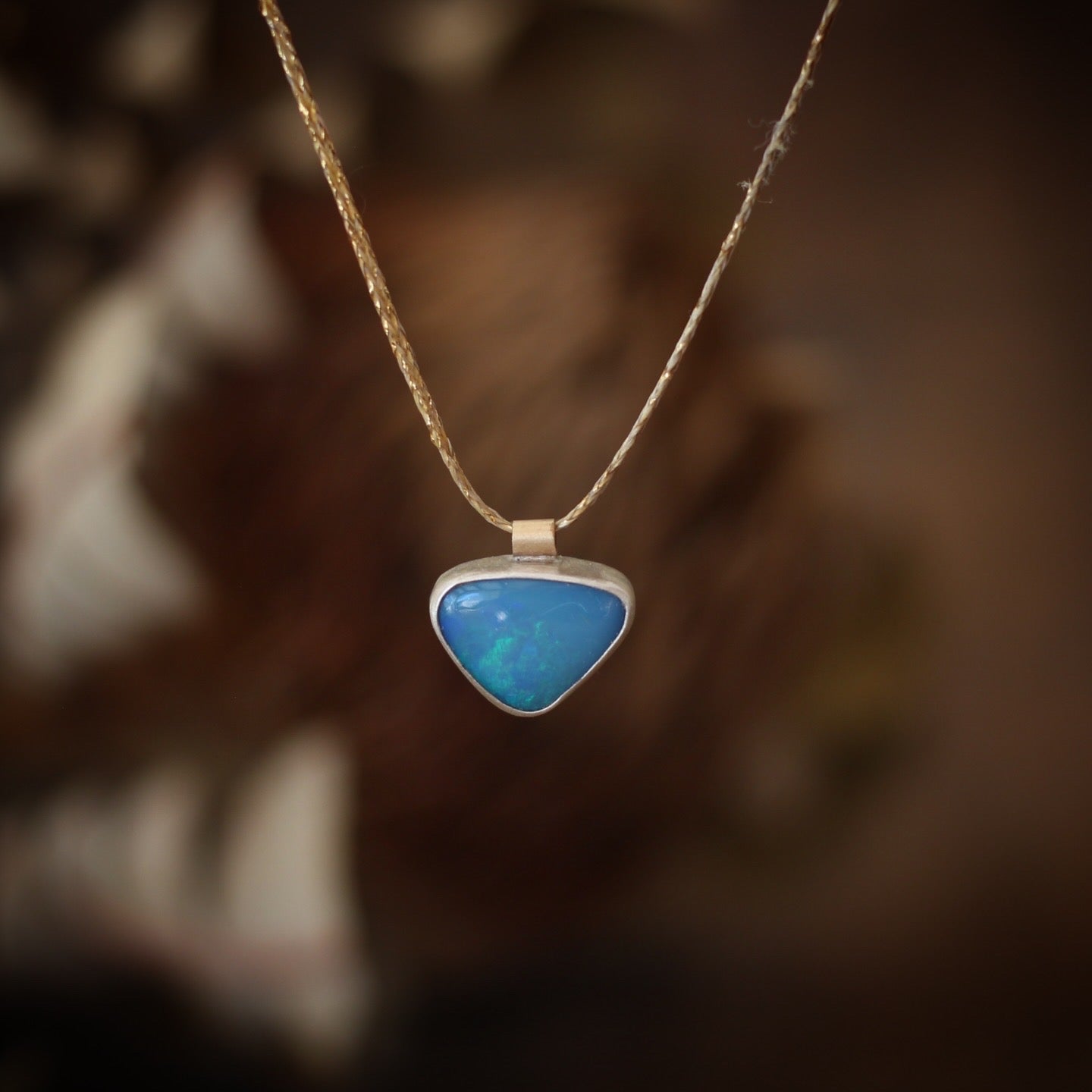 This simple but beautiful necklace is made from a glimmering Austalian Opal doublet that has a vibrant, deep blue glow. It is set in a simple sterling silver setting and hangs from a 14 k gold-filled tube bale and 18" gold cord with a sterling silver spring clasp.