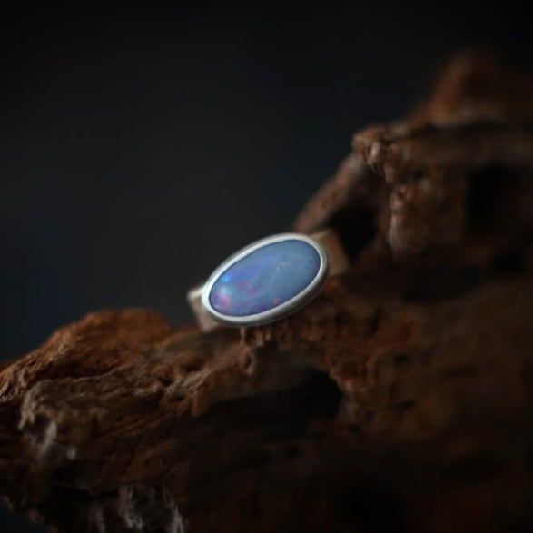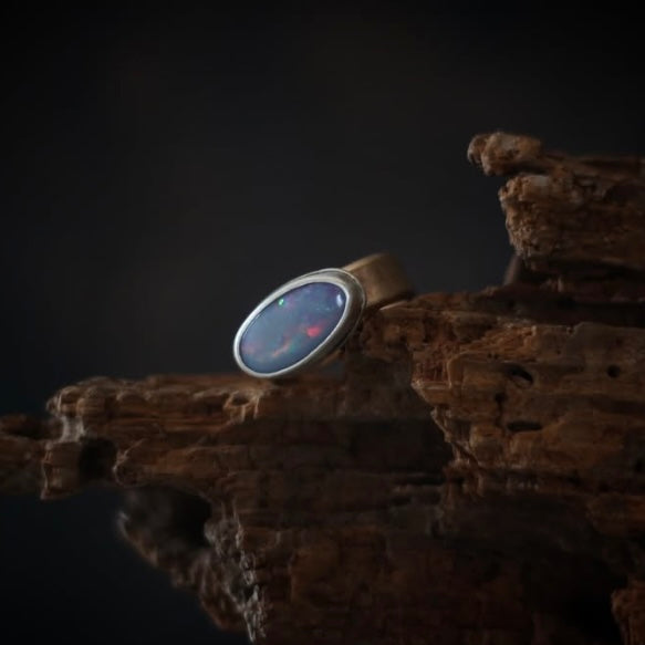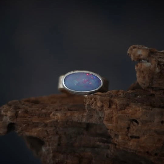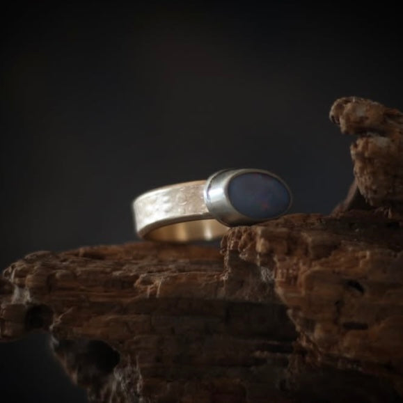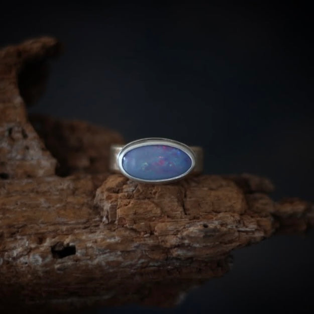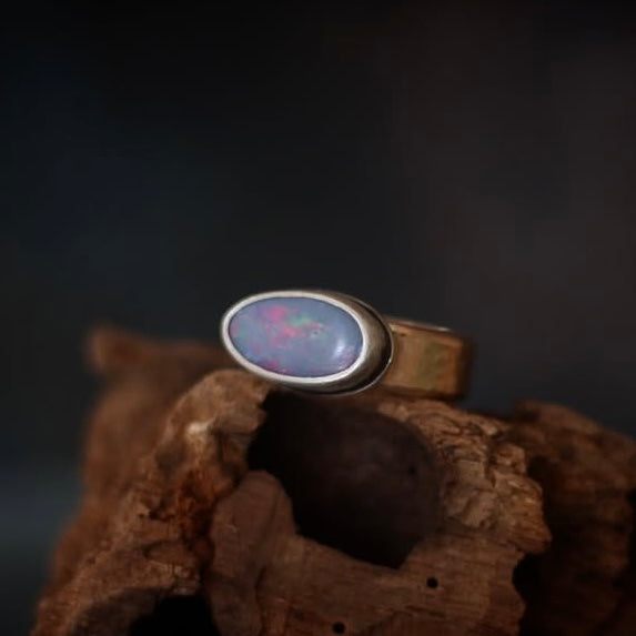 This unique but simple ring features a beautiful Australian Boulder Opal that flashes shades of solder lavender and ruby red. It is set in a simple sterling silver setting. The bright color of the stone is perfectly balanced by the warmth of a chunky 14k gold-filled band that had by rolled through the rolling mill with an organic pebble-like texture. Band measures ~7 mm wide and 2 mm thick.