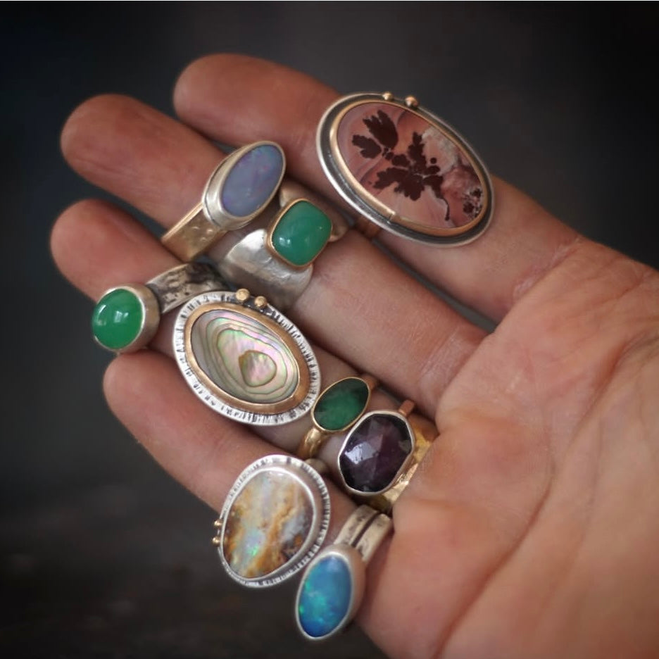 I create powerful, unique, and sacred adornment crafted from Earth's finest gifts. All of my jewelry is hand-made and hand-finished, from natural and often recycled or repurposed materials. I try to use every bit of metal on my bench and not let anything go to waste. In this way, all my pieces are somehow related - melted, remelted, cut, recut, weaving together so many stories being told through the jewelry. No two items are exactly alike and my pieces will have natural imperfections - I believe it is these slight imperfections that give hand fabricated items their soulful character and appeal.