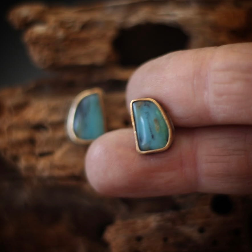 Peruvian Opals set in sterling silver with 14k yellow gold-fill bezels. Sterling silver posts. ~0.75" long.