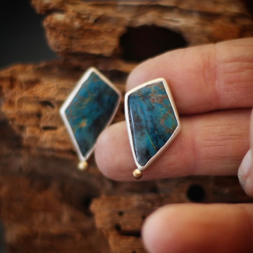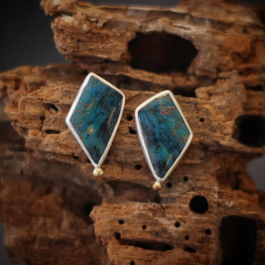 Peruvian Opals set in sterling silver with brass accent beads. Sterling silver posts. ~1.25" long.