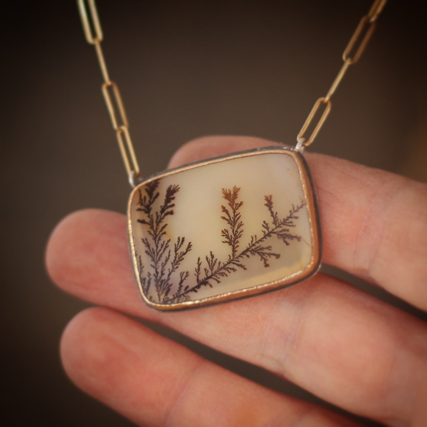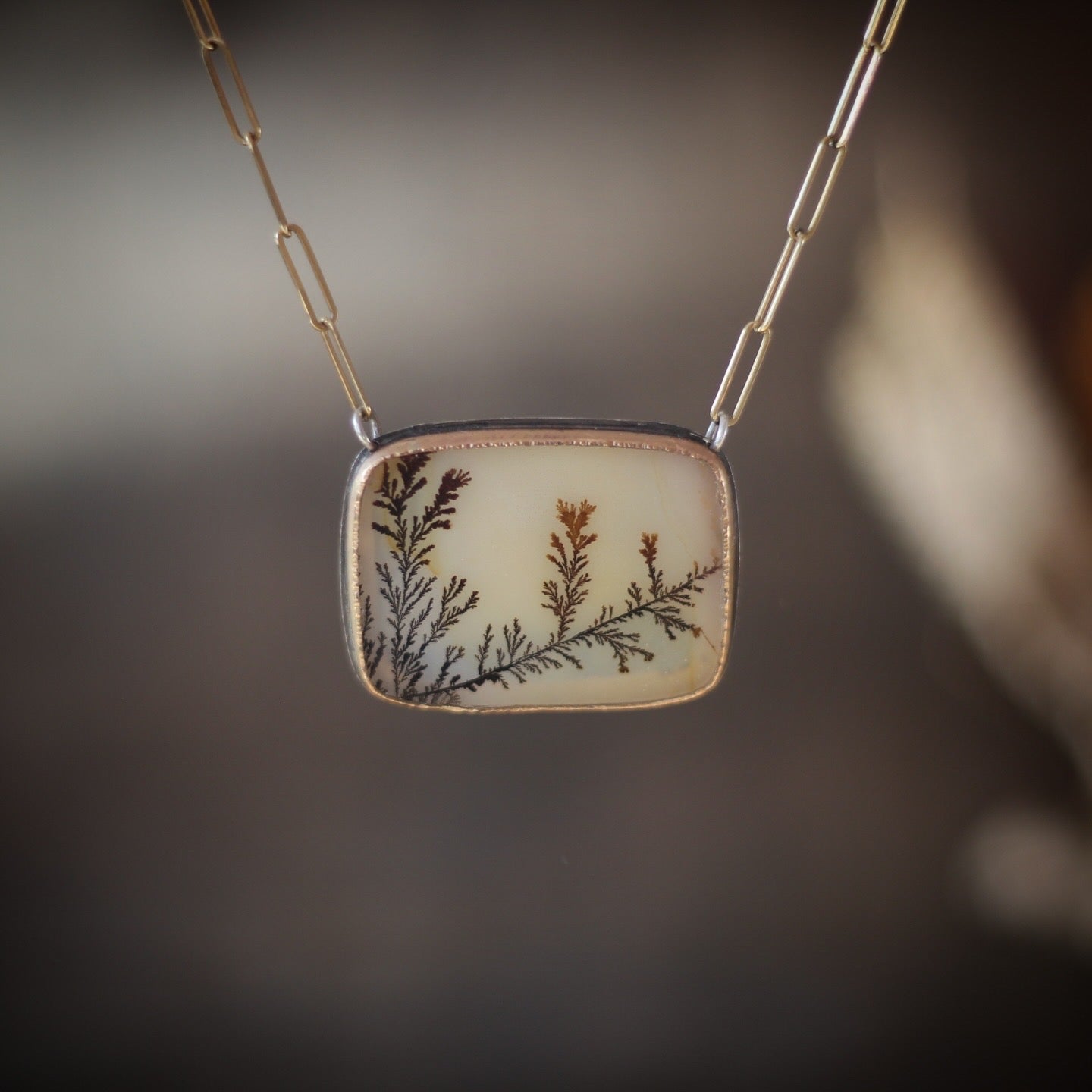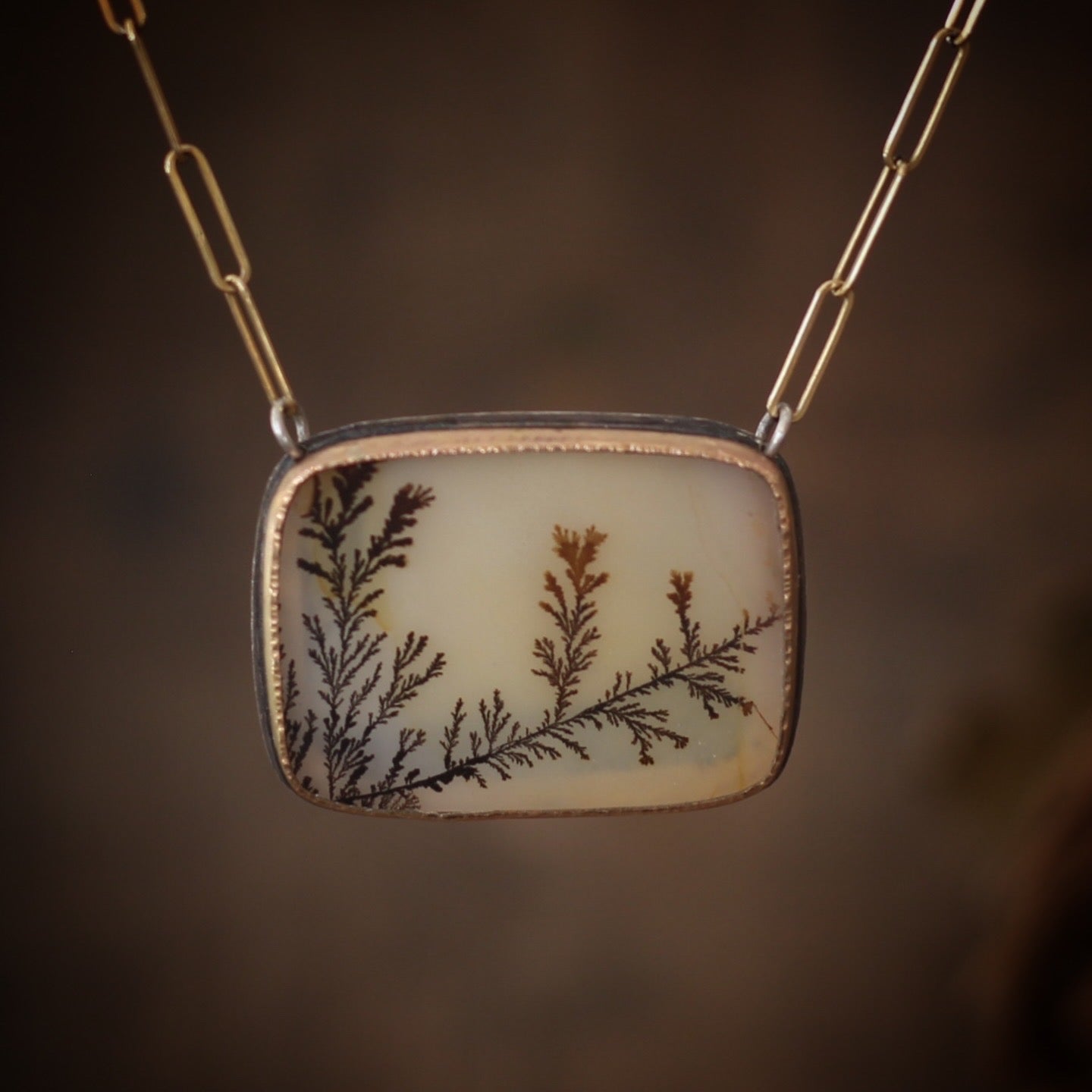This truly unique necklace features a stunning and completely natural Dendritic Agate from the Ken River in Uttar Pradesh India, famous for its agate with tree-like landscape patterns (dendrites) formed by iron/manganese or fossilized fungus. The agate is set in a simple sterling silver and 14k yellow gold-filled setting, so as to not detract from the beautiful detail of the stone.