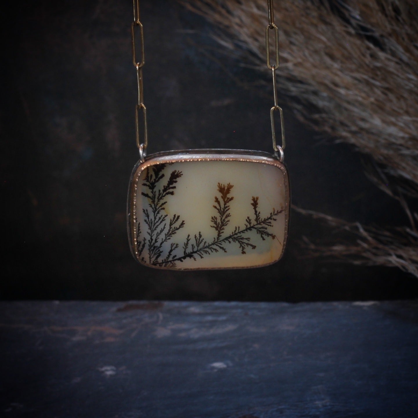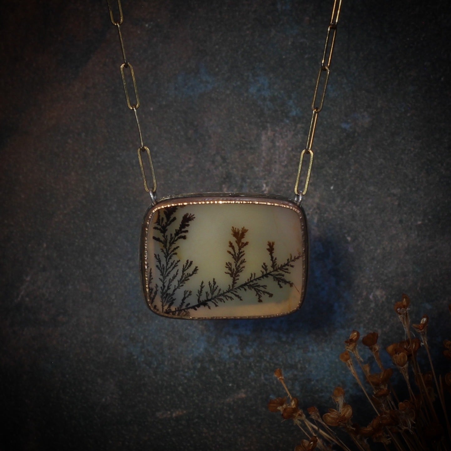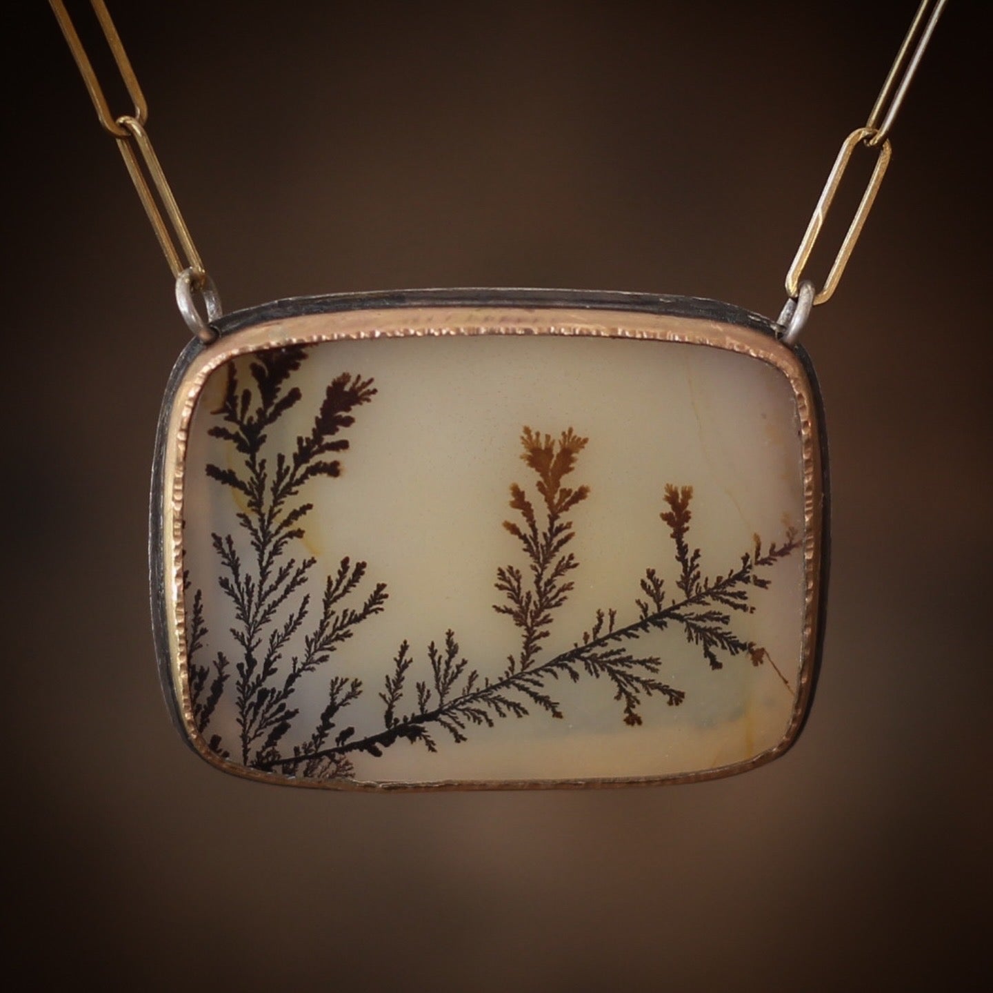 This truly unique necklace features a stunning and completely natural Dendritic Agate from the Ken River in Uttar Pradesh India, famous for its agate with tree-like landscape patterns (dendrites) formed by iron/manganese or fossilized fungus. The agate is set in a simple sterling silver and 14k yellow gold-filled setting, so as to not detract from the beautiful detail of the stone.