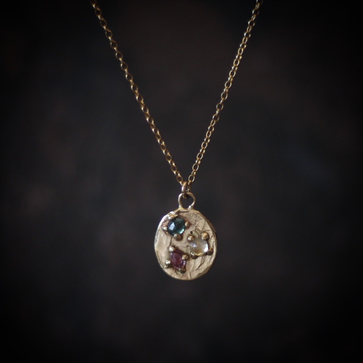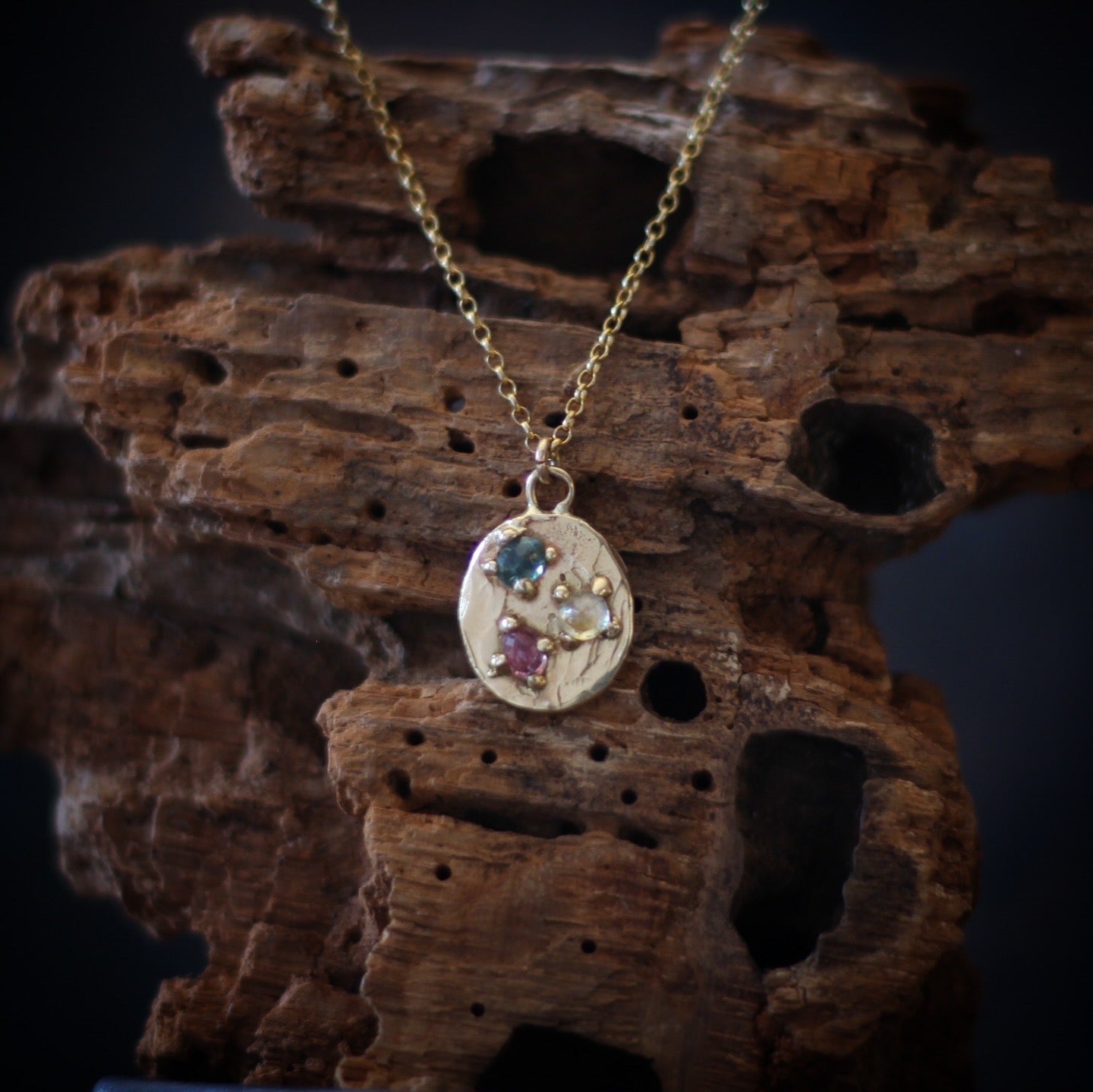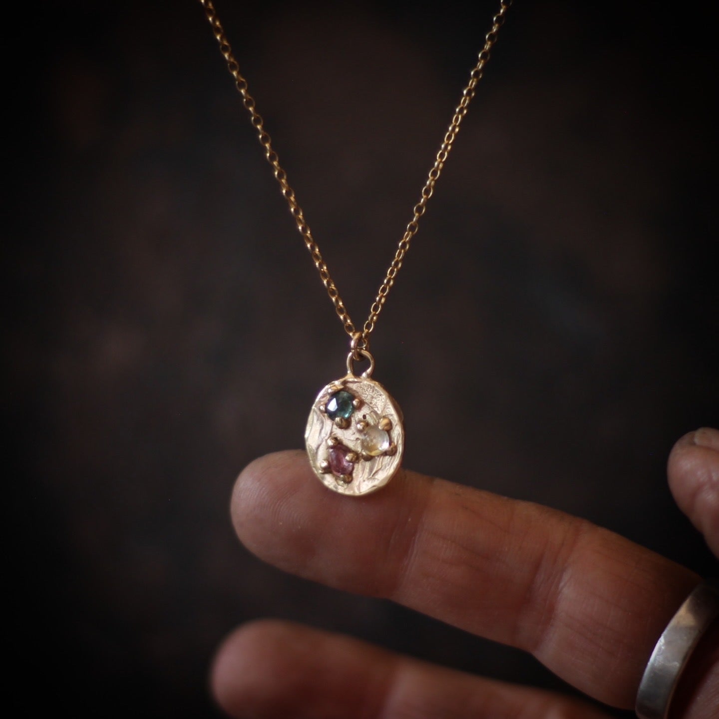 This stunning and organic necklace was made by hand carving wax and casting three rose-cut sapphires in place in recycled solid 14k gold: pink, teal, and soft yellow. The pendant measures approximately 13x15 mm and hangs from an 19” 14k yellow gold-fill rolo chain with a handmade hook and eye clasp. A 14k gold chain can be added for $350 additional cost - request upon ordering.