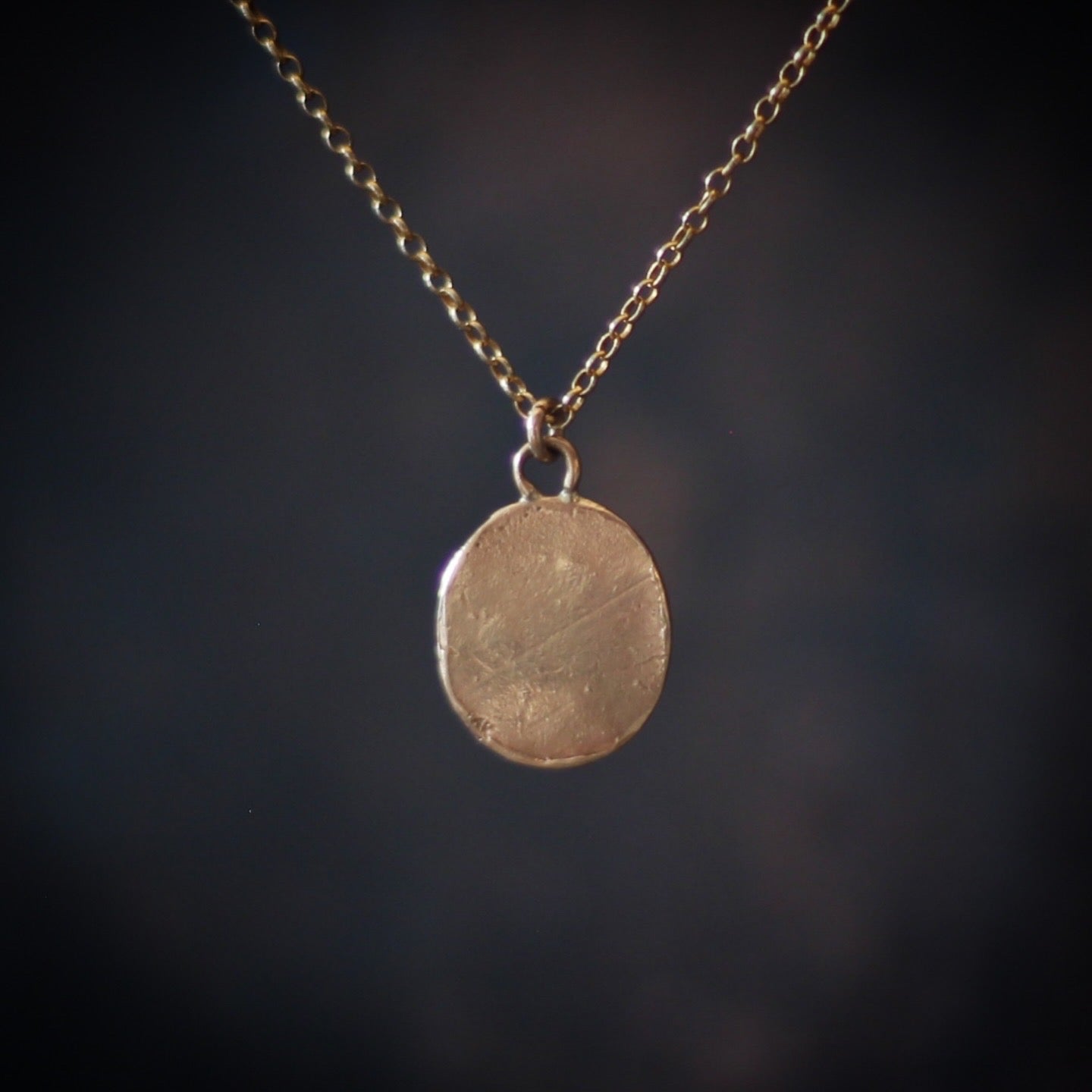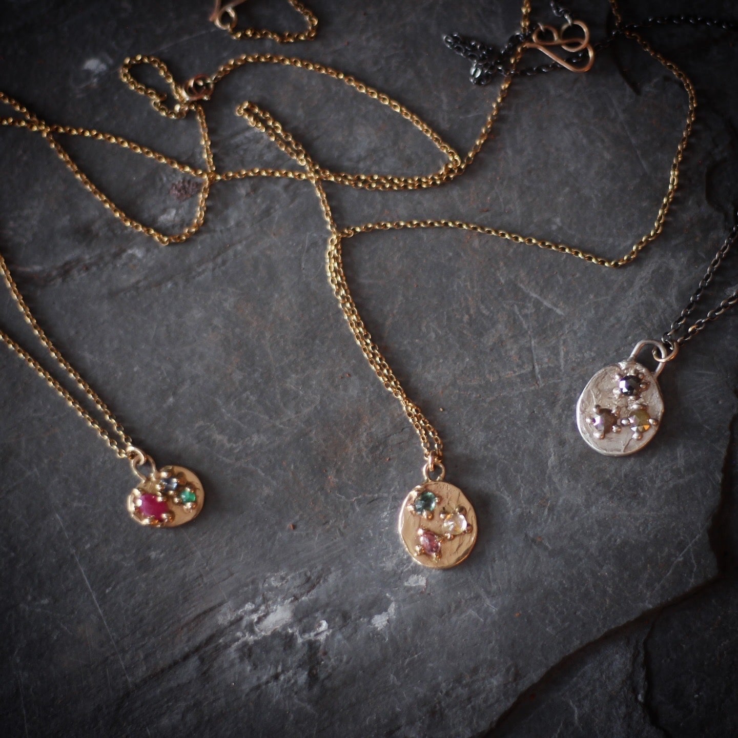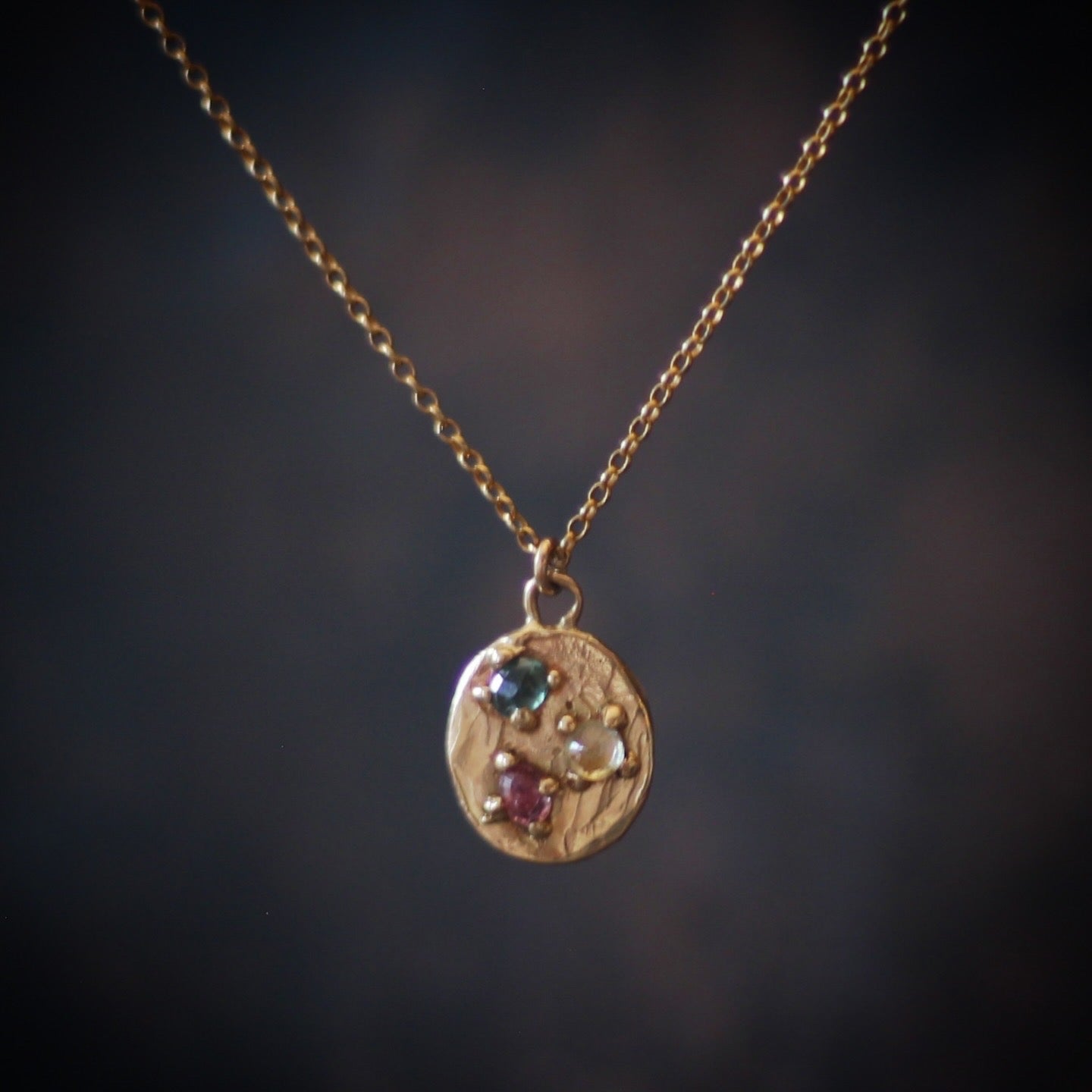 This stunning and organic necklace was made by hand carving wax and casting three rose-cut sapphires in place in recycled solid 14k gold: pink, teal, and soft yellow. The pendant measures approximately 13x15 mm and hangs from an 19” 14k yellow gold-fill rolo chain with a handmade hook and eye clasp. A 14k gold chain can be added for $350 additional cost - request upon ordering.