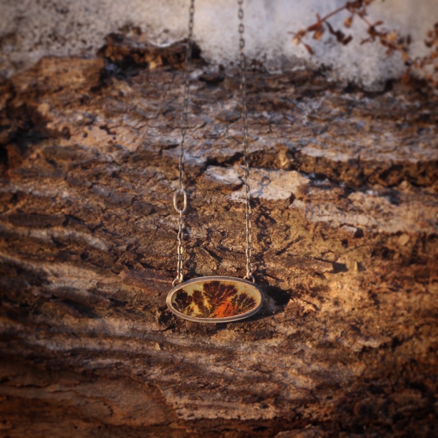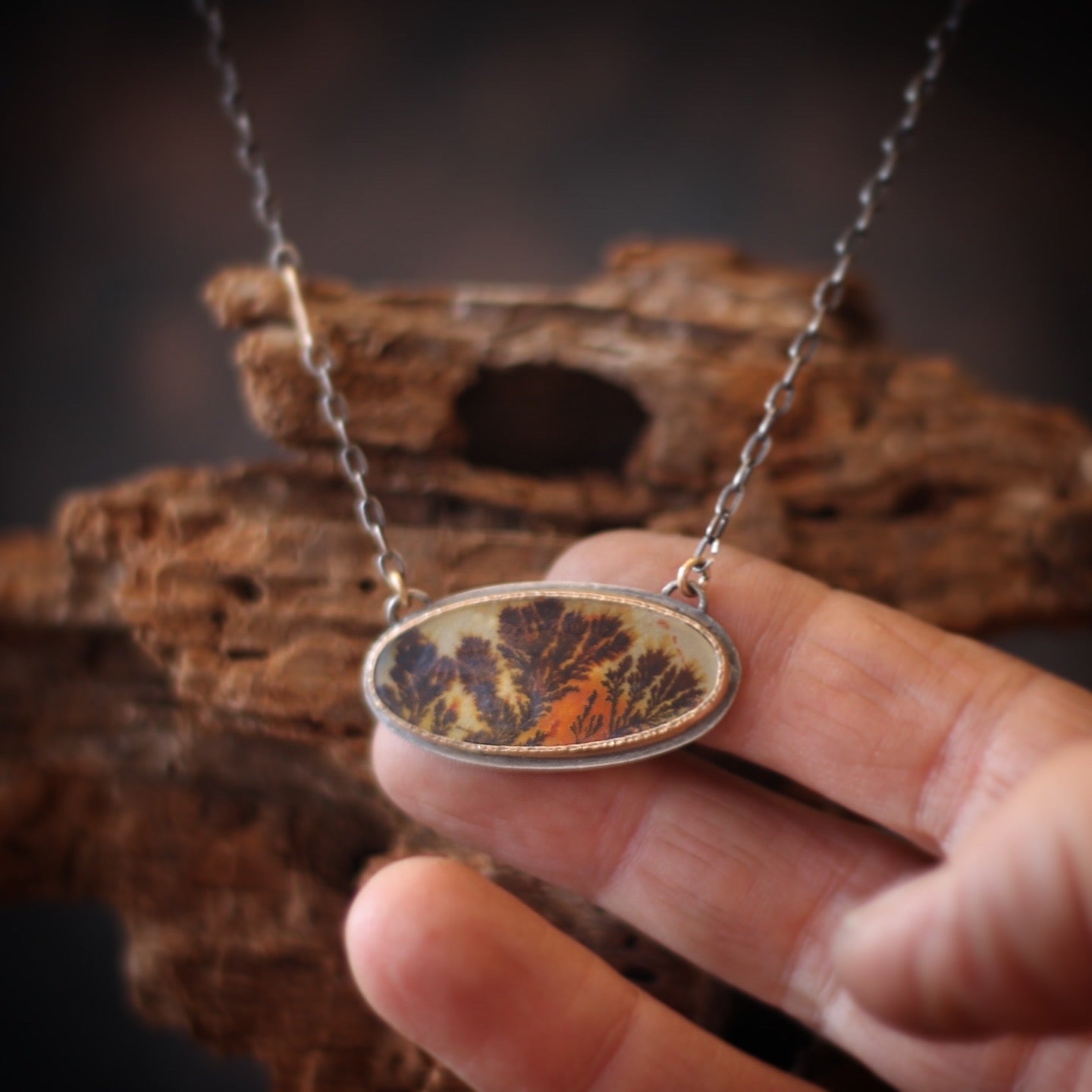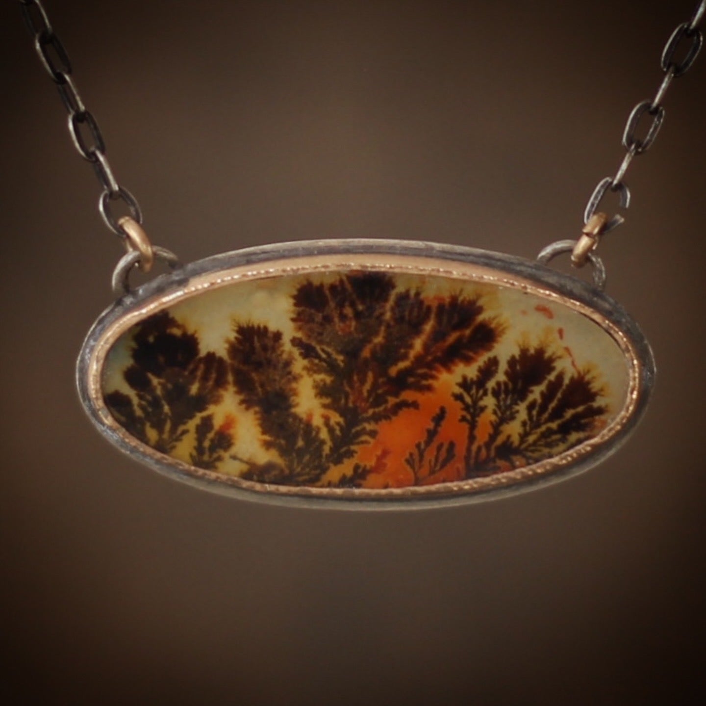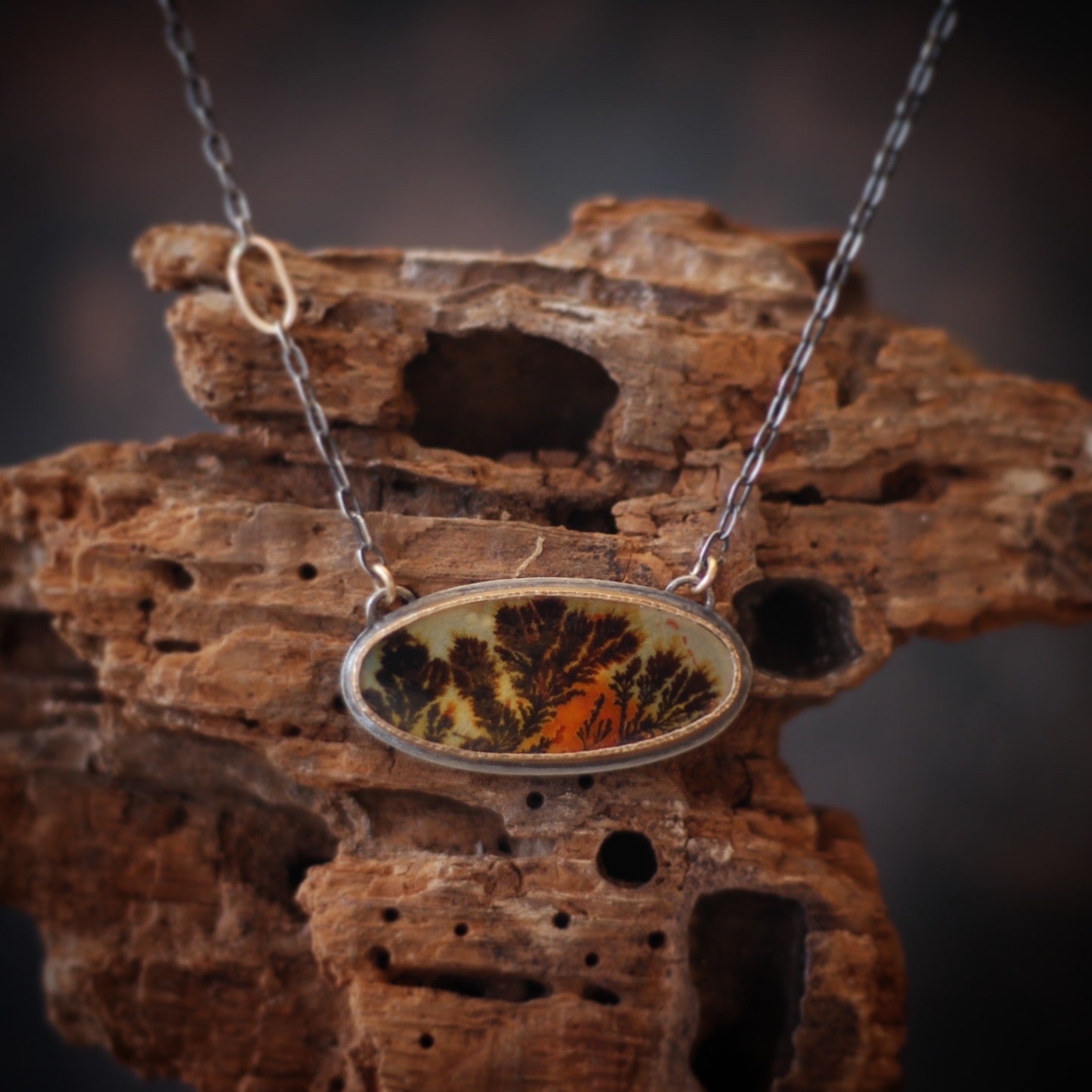 This beautiful necklace features a stunning and completely natural Dendritic Agate from the Ken River in Uttar Pradesh India, famous for its agate with tree-like landscape patterns (dendrites) formed by iron/manganese or fossilized fungus. The agate is set in a simple sterling silver and 14k yellow gold-filled setting, so as to not detract from the beautiful detail of the stone.