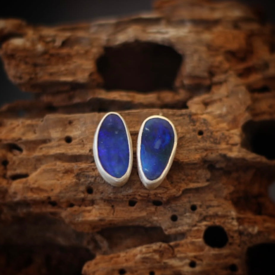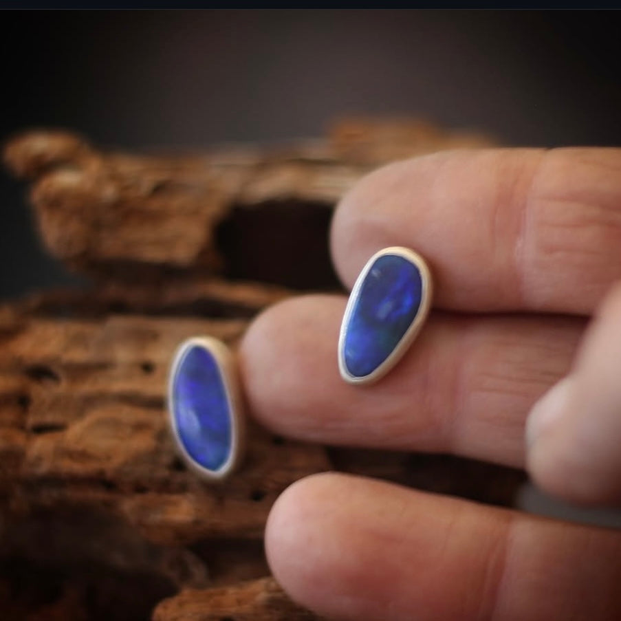 Deep blue Australian Opals set in sterling and fine silver. Sterling silver posts. ~0.75" long.