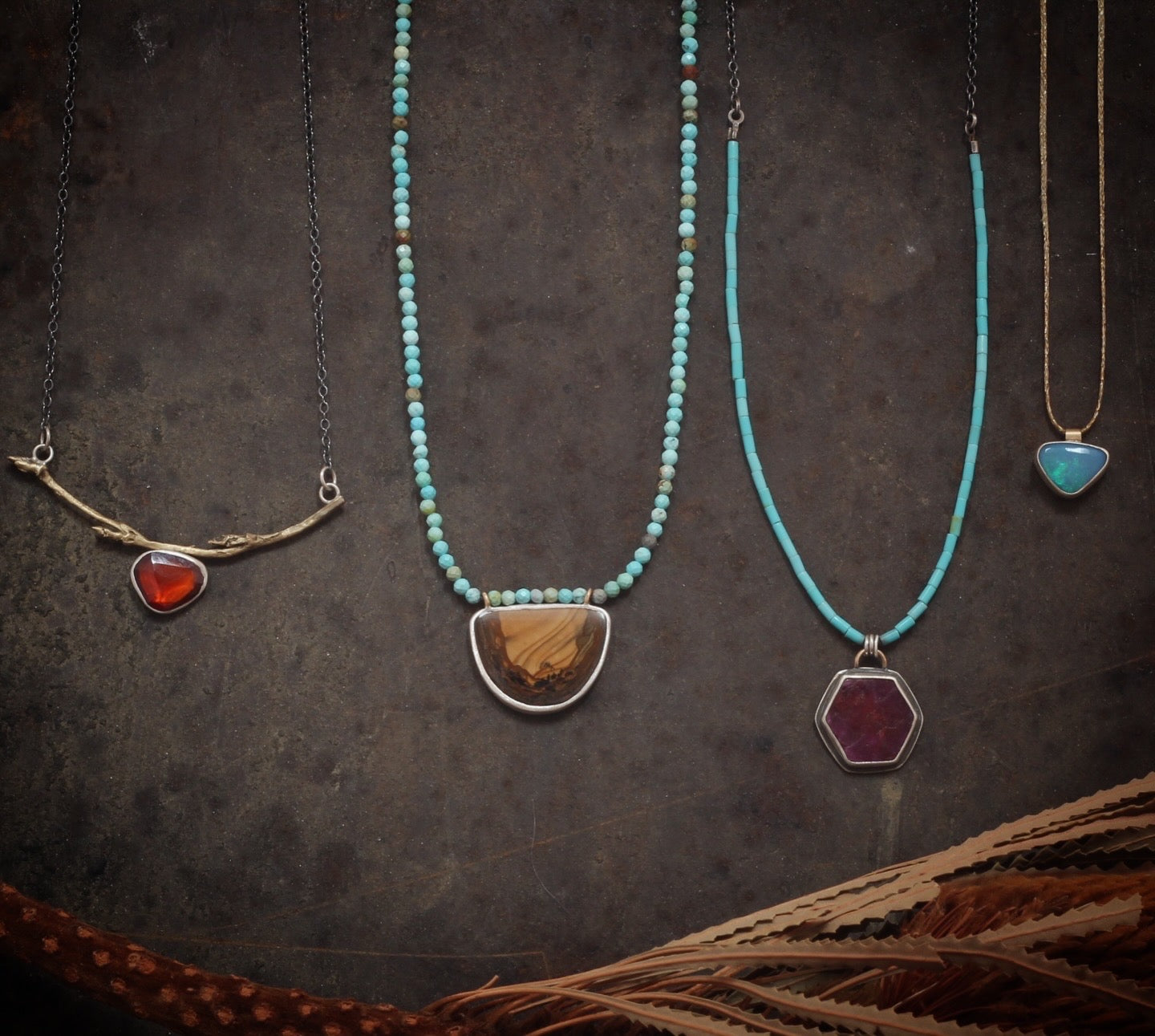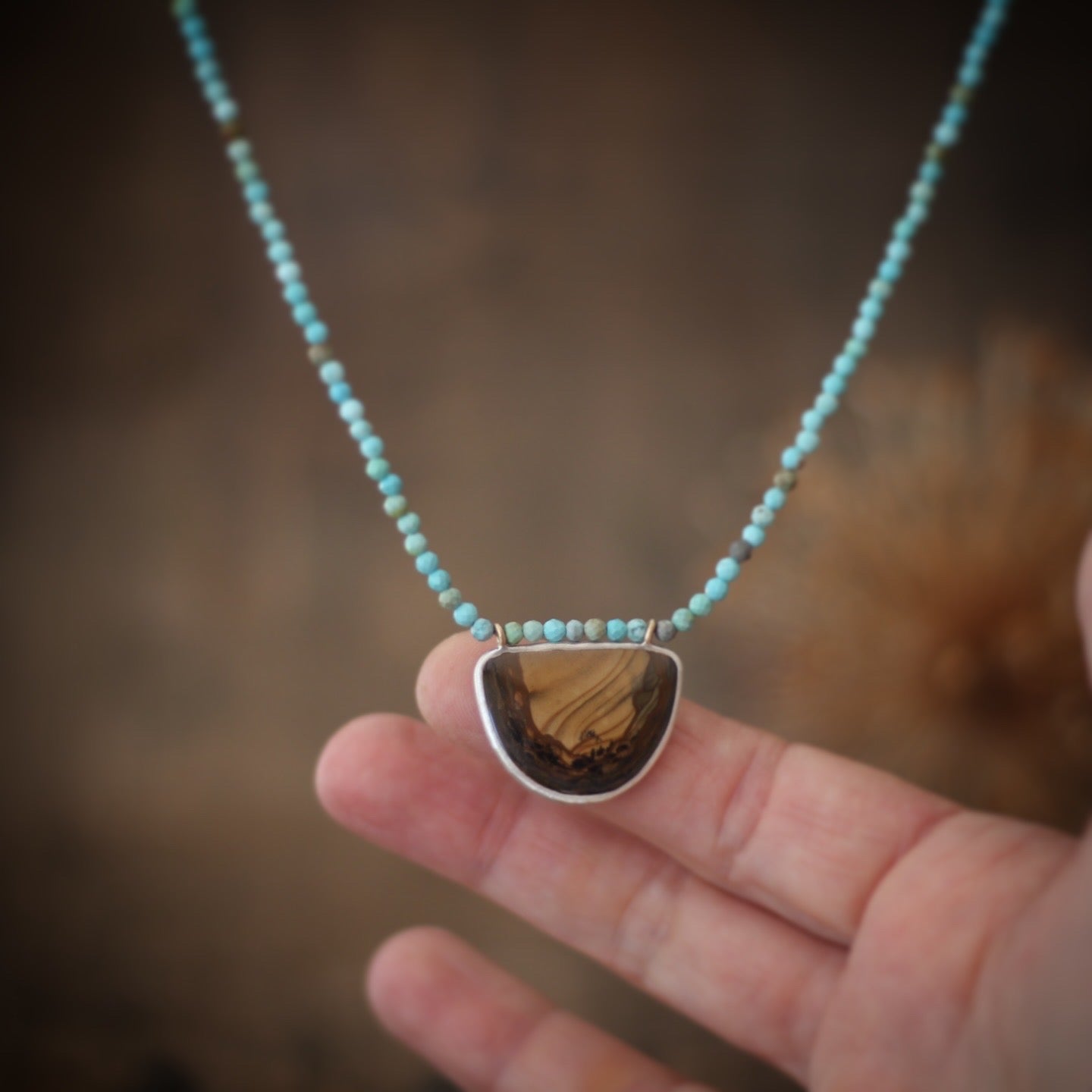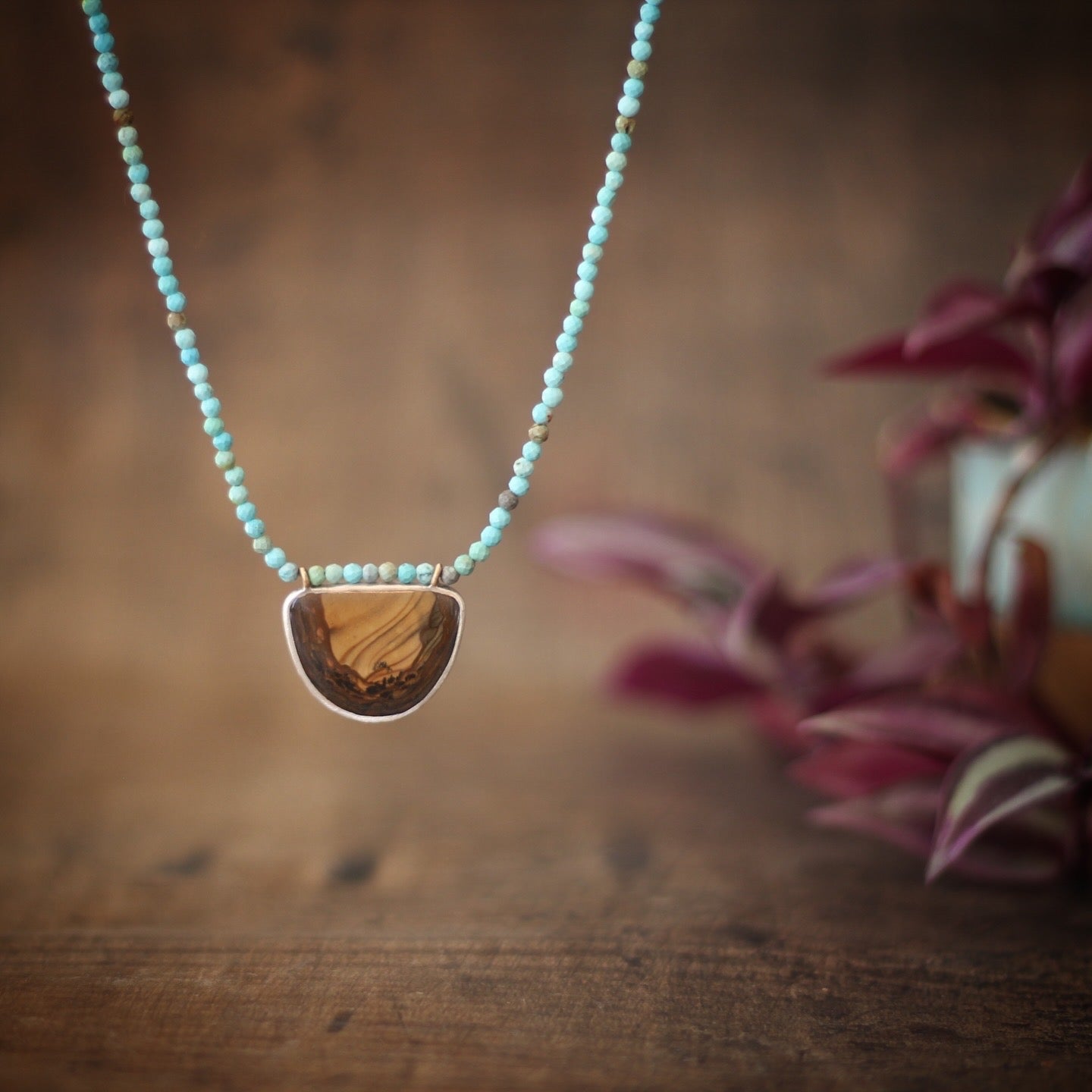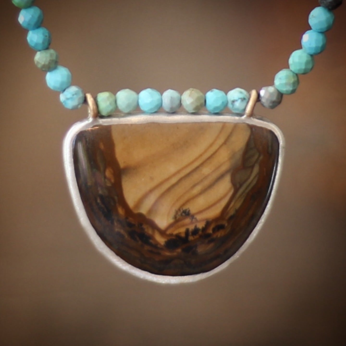 The focal point of this unique and beautiful necklace is a rare Bruneau Jasper, a highly prized, semi-precious gemstone from the remote Bruneau River Canyon in Idaho, known for its stunning deep reds, browns, creams, and unique orbicular (eye-like) patterns. Valued by collectors and lapidary artists, it's considered a rare and valuable "picture jasper," though mining has largely ceased due to difficult access, making it hard to find.