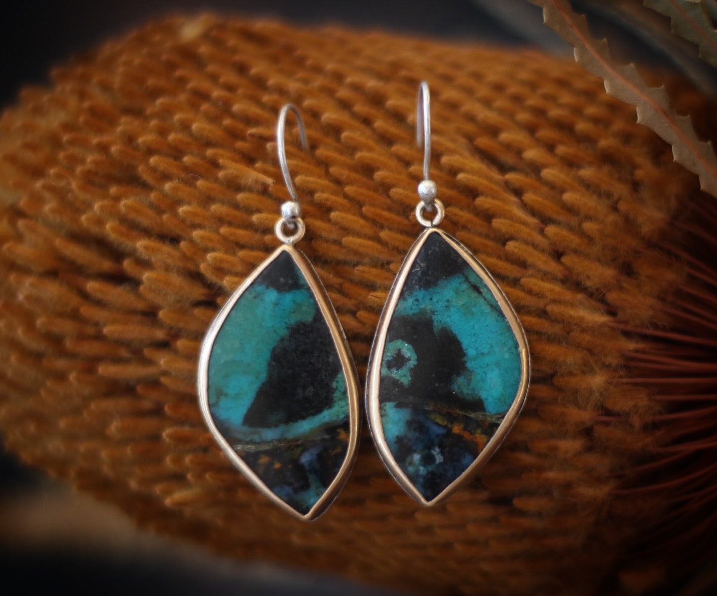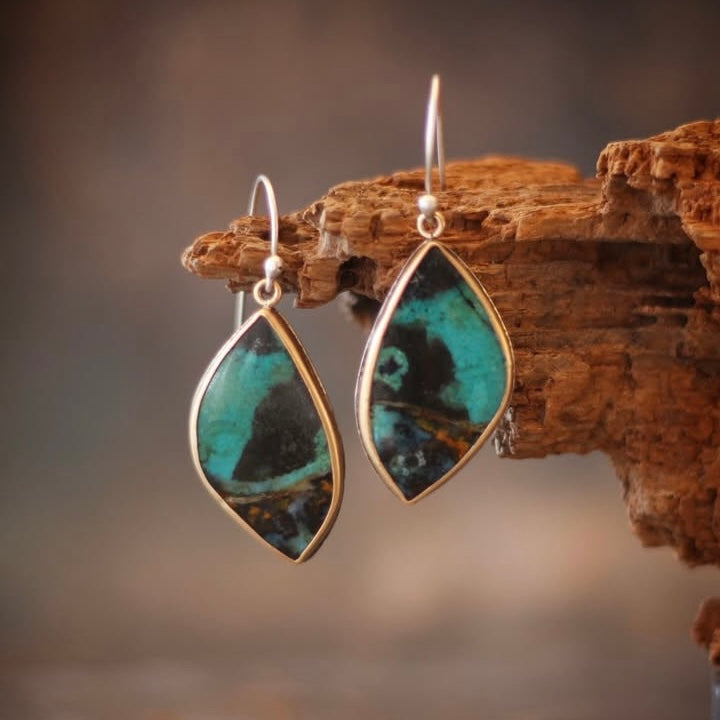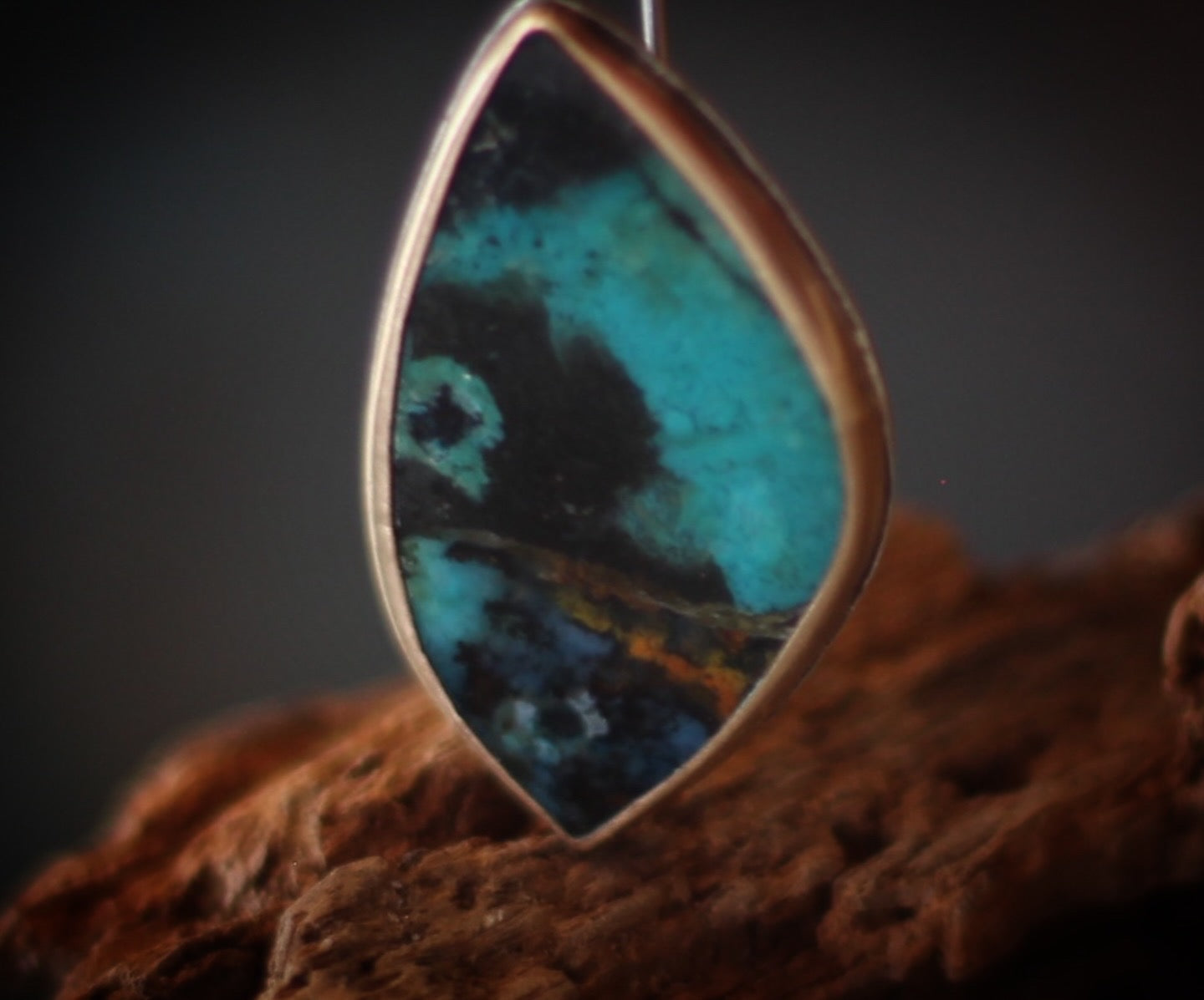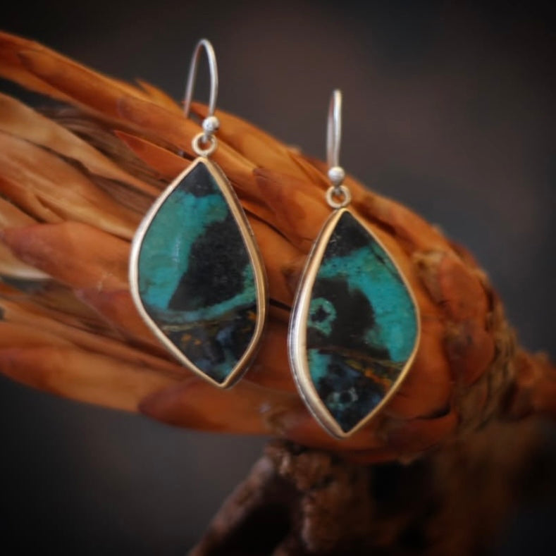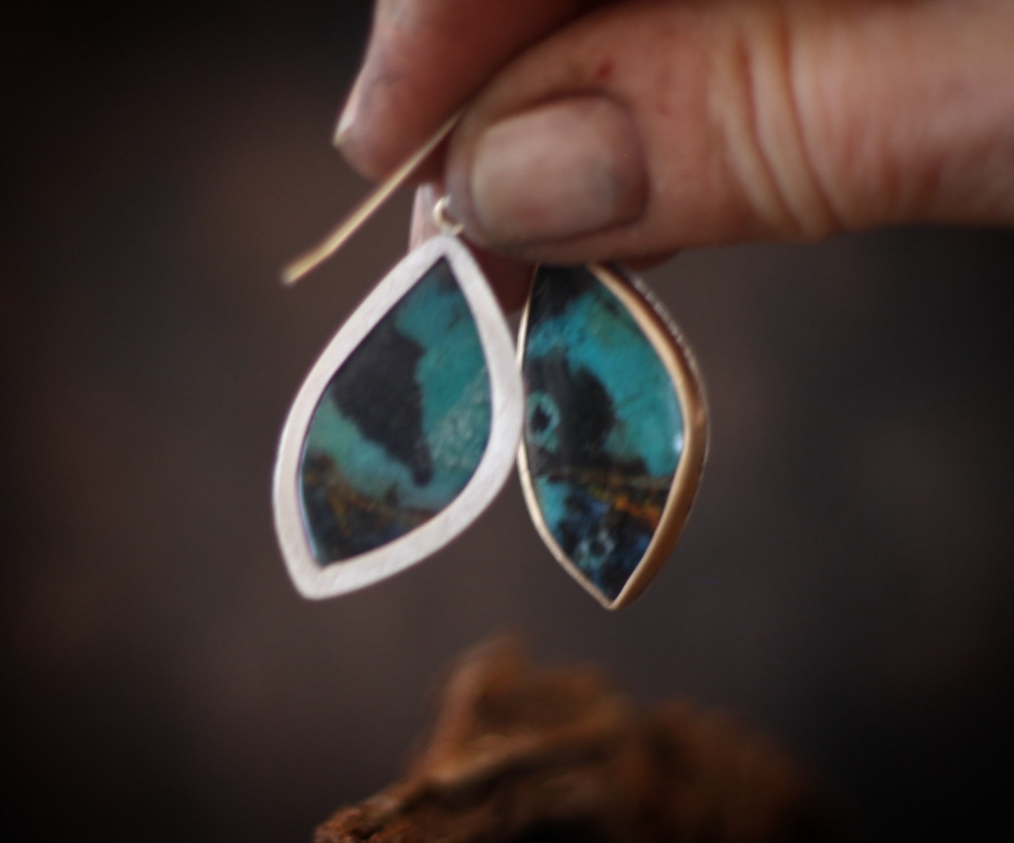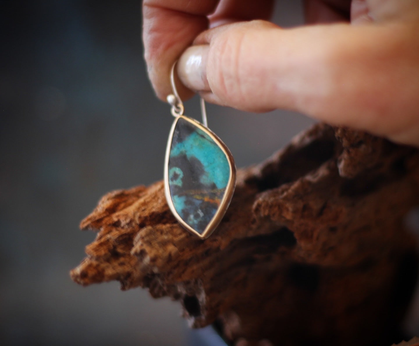 These beautifully organic earrings feature a striking pair of Indonesian Opalized Wood stones set in 14k yellow gold-fill bezels and sterling silver base plates and earring wires. ~2" long with ear wire.