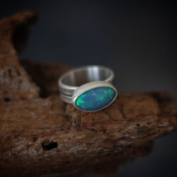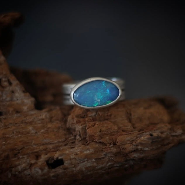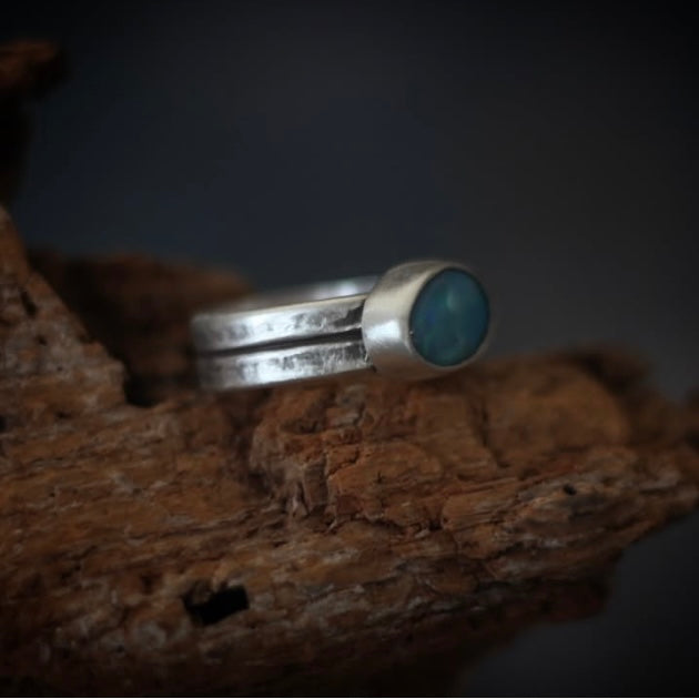 This unique but simple ring features a beautiful Australian Boulder Opal that flashes shades of blue and turquoise. It is set in a simple sterling silver setting with a double silver band with an organic texture. Band measures ~4 mm wide.