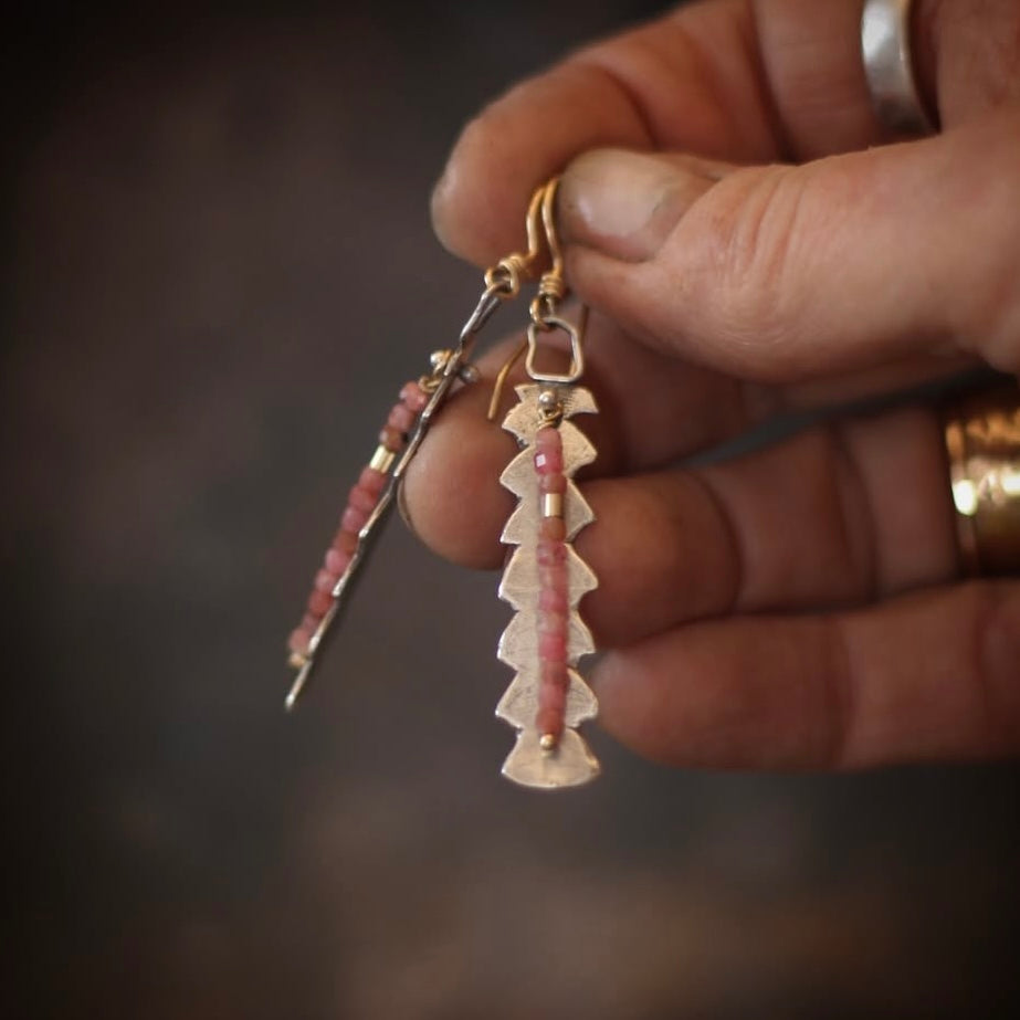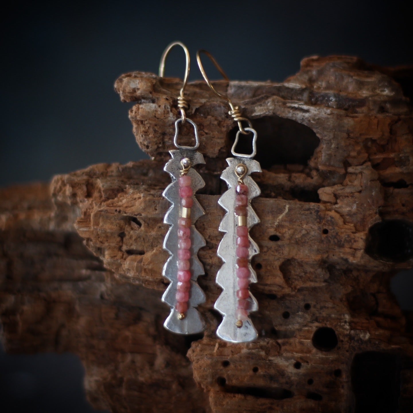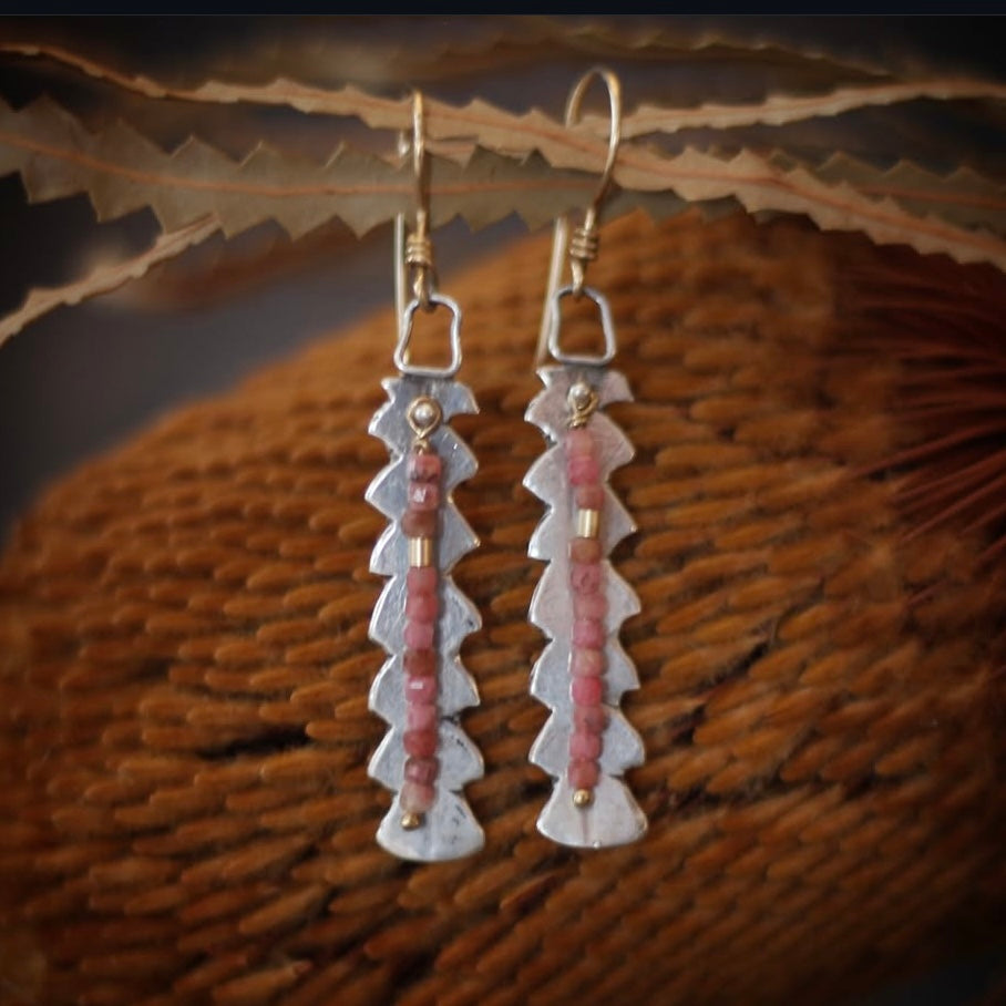 These uniquely beautiful earrings were made from casting Banksia leaves in sterling silver - they are accented with faceted Rhrodocrosite and 14k yellow gold-full beads for a pop of color and a perfect contrast to the rugged beauty of the leaves. They are 2 1/4" long with the 14k gold-fill earring wire.