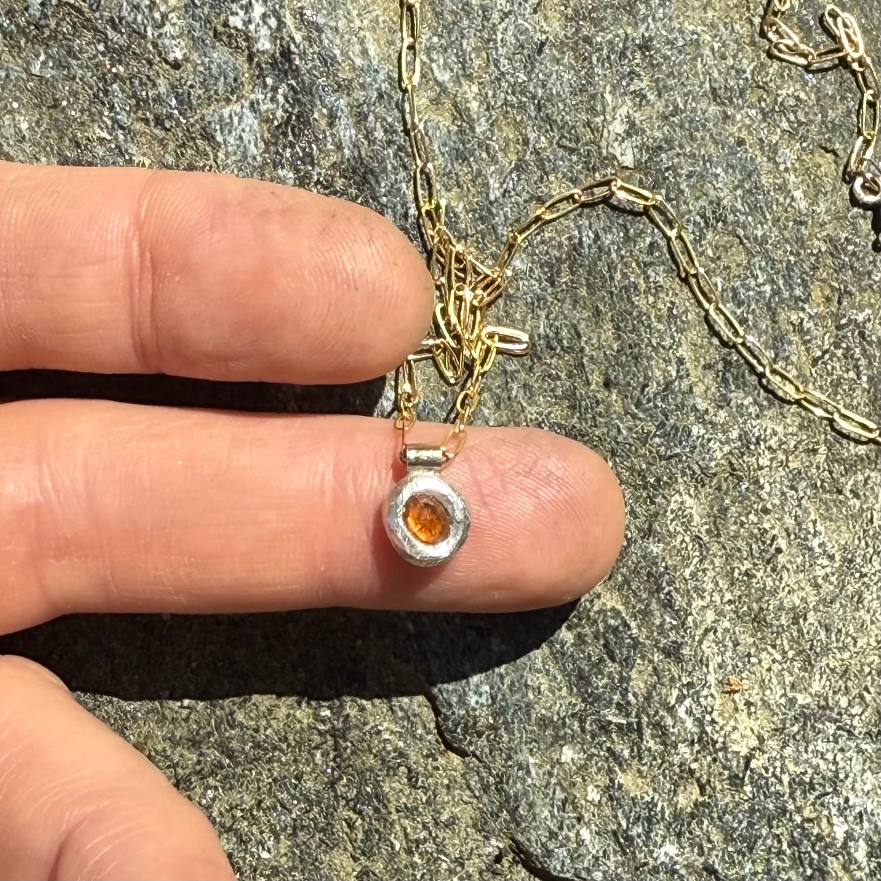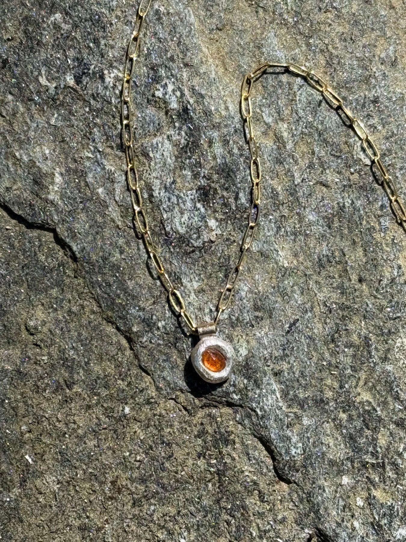 Natural orange sapphire set in sterling silver on a 14k gold-filled elongated cable chain. 18"